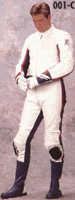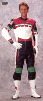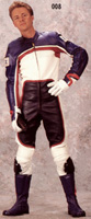 Suits 2200 & 2200W include: Custom tailoring w/choice of colors, Grade "A", 3 ounce competition weight leather, closed cell padding in shoulders, closed cell & leather padding elbow/forearms, hips & knee/shins, extra leather seat pad, back "action" paneled upper shoulders with perforation for air flow. (Action panel is for easy forward arm movement.) Two zippered vents chest, inner sleeves (bicep area) & lower back, two front jacket pockets, two piece zip together waistband & waist zipper with elastic snap waistband inside pants for comfort and snug waist fit when jacket is taken off, heavy duty brass zippers, flex panel lower back, adjustable velcro collar & mesh lining. *Suit 001-A includes: All features of 001-B through 064 with following: Closed cell & leather padding elbow/forearms, hips, knees, closed cell padding in shoulders. (no body armour) No perforation, flex panels above knees or stretch behind knees. This suit will get the job done, but it is a more conservative, classic look. This is a solid color suit. (not shown in catalog) *Suit 001-B includes: All features of 001-B through 064. One minor difference: It is a solid color suit. This suit is perfect for the racetrack or the serious road warrior. (not shown in catalog) Customize your suits with custom lettering! If we don't already have your logo we can reproduce it. Please submit for price quote.